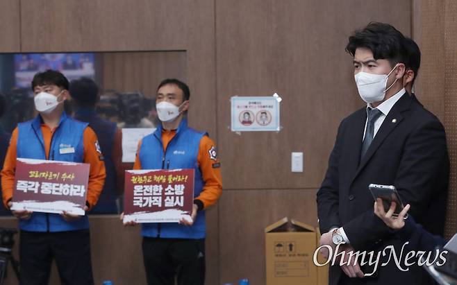 | ▲ 소방노조 회견 지켜보는 소방관 출신 오영환 의원 소방관 출신인 오영환 더불어민주당 의원(오른쪽)이 14일 오후 서울 여의도 국회 소통관에서 열린 대한민국공무원노동종합총연맹 소방공무원노동조합(공노총 소방노조) 고진영 위원장을 비롯한 조합원들의 기자회견을 지켜보고 있다. 이날 오전 이태원 참사 관련 이상민 행정안전부 장관을 직무유기와 업무상과실치사상 혐의로 경찰에 고발한 소방노조는 오후 국회를 찾아 여야가 진상규명을 위해 초당적 협력에 나서라고 촉구했다. |