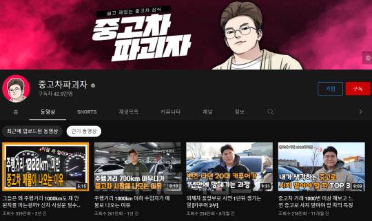 1위를 차지한 '중고차 파괴자'는 구독자 42만 명, 누적 조회 수 1억 3000만 회를 보유한 이 분야 대표 채널이다. 2019년 말부터 본격적인 활동을 시작해 6개월여 만에 구독자 10만 명을 돌파하고, 이후에도 빠른 성장세를 이어가며 3년 만에 40만 명의 고지를 넘어섰다. 현재 국내 모든 유튜브 채널을 통틀어 상위 1%에 해당하는 인기를 누리고 있다.