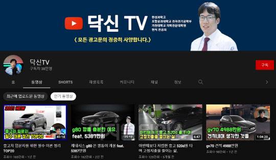 2위에 오른 '닥신TV'는 구독자 38만 명, 누적 조회 수 6600만 회를 보유한 채널이다. 본업이 의사인 채널 운영자 '닥신'(본명 신제욱)은 자동차 리뷰, 맛집 소개, 코스트코 제품 추천, 일상 브이로그 등 다양한 콘텐츠를 제작하지만, 그중 가장 주력으로 내세우는 것은 중고차 콘텐츠다. "나는 중고차 비전문가"임을 강조하지만, 여느 전문가보다 날카로운 분석을 내놓고, 지인이나 본인이 직접 경험한 중고차 구매 및 활용기를 공유하며 실용적 정보를 전달해 인기가 높다. 채널 내 최고 인기 영상은 '중고차 입문자를 위한 필수 이론 정리 TOP20'로 160만 회가 넘는 높은 조회 수를 올리고 있다.