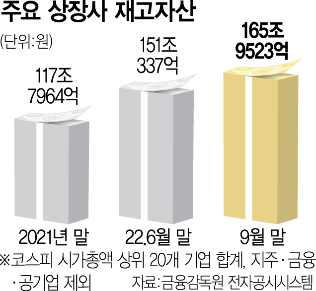 국내 주요 상장사 20곳의 재고 규모가 전 분기 대비 약 10% 증가해 3분기 말 기준 166조 원으로 집계됐다.