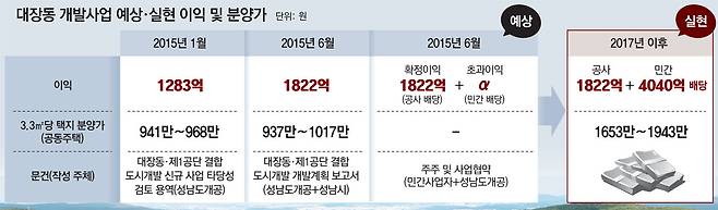 성남도시개발공사가 2015년 대장동 개발사업 당시 수익의 지표인 택지 분양가를 평(3.3m²)당 1000만 원 이하로 산정해 예상 이익을 1822억여 원으로 축소한 내부 보고서를 만든 것으로 15일 확인됐다. 공사 내부에서 ‘유원(one)’으로 불린 유동규 전 공사 사장 직무대리와 전략사업실장을 지낸 정민용 변호사 등 ‘대장동 일당’이 예상 비용은 부풀리고 분양가 등 예상 이익은 낮춰 공사에 돌아갈 이익을 최소화하려 한 것이다.