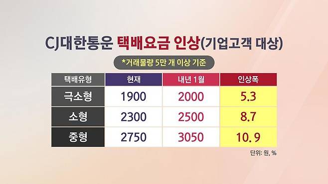 택배시장의 절반을 장악하고 있는 업계 1위 CJ대한통운이 내년 1월부터 택배요금을 올립니다. 온라인쇼핑몰 등 기업고객들한테 받은 택배요금을 1년 만에 최대 10% 넘게 올린다고 하는데요. 롯데, 한진 등 경쟁사들도 따라 올릴 것으로 보이고, 소비자들 배송비도 인상 압박을 받게 됐습니다. 박규준 기자, CJ대한통운이 택배 가격을 어느 정도 올리나요?