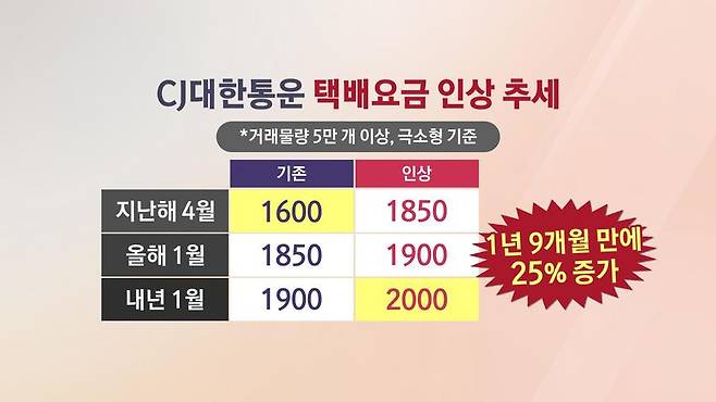 '사회적합의'에 따라 택배사와 대리점이 지급해야 하는 분류인력 비용과 택배기사 산재, 고용보험료 등 비용이 늘어난 게 인상의 주된 요인으로 보입니다.