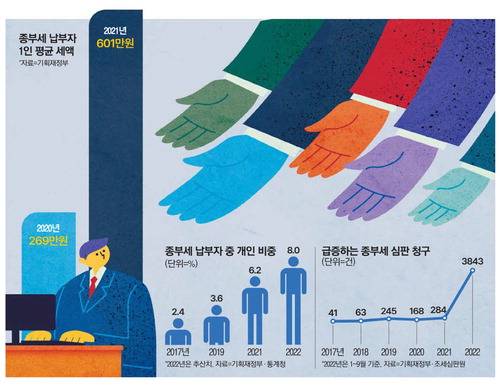 주택 소유자(1509만명) 중에서 종부세를 내는 개인 비중도 올해 약 8.0%로 역대 최고치를 기록할 전망이다. 문재인 정부 집권 초인 2017년만 해도 종부세를 내는 개인 비중은 2.4%에 그쳤지만 가파른 공시가에 세율 인상이 겹치며 납부 대상이 크게 늘었다.