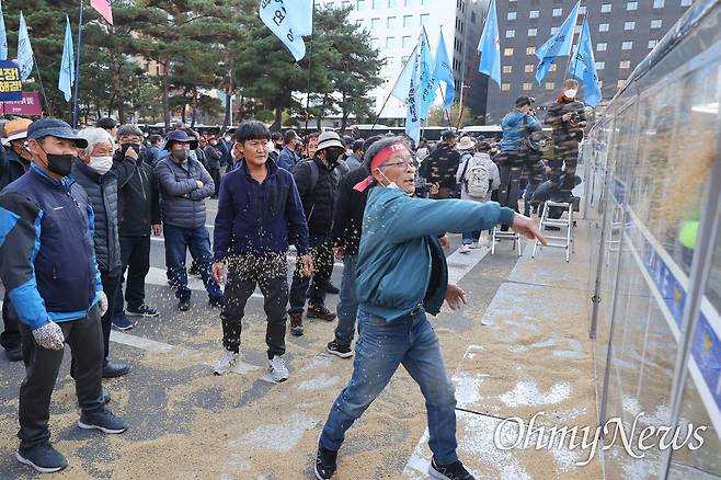 | ▲ 전국에서 상경한 전국농민회총연맹, 전국여성농민회총연합, 카톨릭농민회 등 농민들이 16일 오후 서울 여의도 국민은행 앞에서 윤석열 정부 농정규탄 전국농민대회를 마친 뒤 국회로 행진을 진행하던 중 경찰에 의해 저지되자 나락을 뿌리고 있다. |