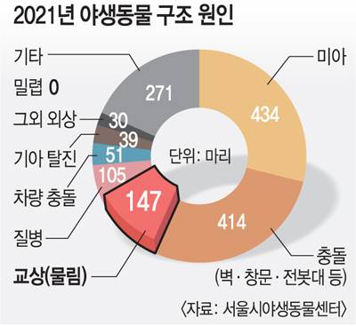 2019년부터 지난 9일까지 ‘포식자 공격’으로 서울시야생동물센터에 구조돼온 야생동물은 496마리였다. 도심 속 작은 동물 사이에선 고양이가 최상위 포식자라는 점을 고려하면 이들의 90% 이상이 고양이에게 공격당했으리라는 게 하 수의사의 설명이다. 공격받은 동물은 95% 이상이 조류였지만 족제비, 청설모 같은 포유류와 파충류인 자라도 포함돼 있었다. 이 명단엔 멸종위기종이 4마리, 천연기념물은 15마리가 올라 있었다. 서울 도심에도 남산공원, 여의도 샛강생태공원, 암사생태공원 등이 있어 황조롱이, 솔부엉이 같은 천연기념물뿐 아니라 새호리기, 청머리오리를 비롯한 멸종위기종이 서식한다.