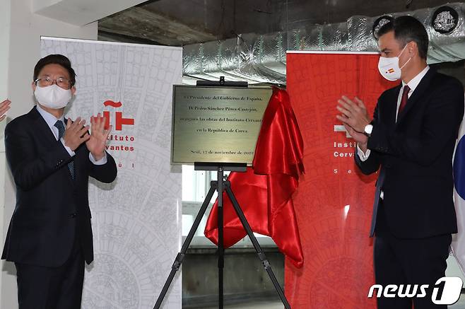 (서울=뉴스1) 송원영 기자 = 박보균 문화체육관광부 장관과 페드로 산체스 스페인 총리가 17일 서울 중구 유네스코회관에 위치한 세르반테스 문화원 예정지에서 현판식을 하고 있다. 2022.11.17/뉴스1