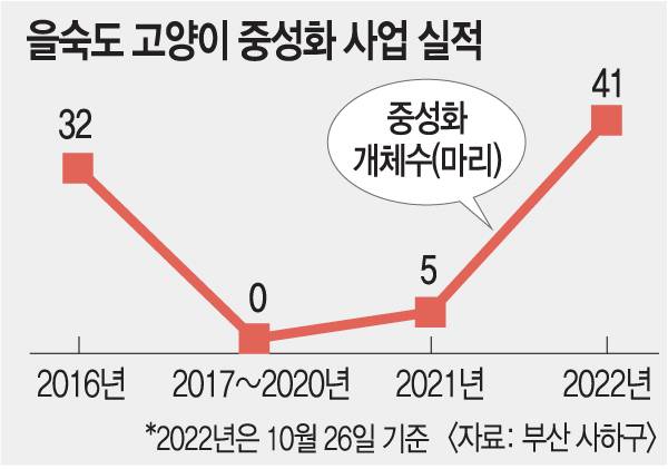 중성화수술을 위한 포획도 급식소 주변 고양이만 잡거나 민원이 집중적으로 제기될 때만 실시하는 등 형식적인 수준이다. 최근 야생동물치료센터가 생후 5개월 된 고양이를 포획해 사하구에 연락했더니 “TNR 사업을 할 때까지 기다려 달라”는 답변만 돌아왔다고 한다.