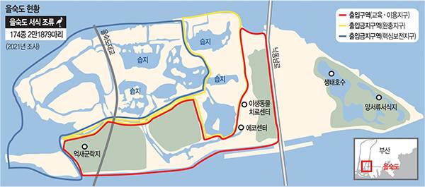 야생화한 고양이는 다른 섬들에서처럼 새를 공격하거나 알을 깨서 먹는 등 숱한 우려를 불러일으켰다. 결국 2016년 지방자치단체가 개입했는데 관할인 부산 사하구는 을숙도 내 고양이를 섬 밖으로 내보내는 대신 철새와 함께 살아가는 방안을 내놨다. 세칭 ‘캣맘’으로 불리는 애묘인들이 모인 한 동물보호단체의 건의로 사하구가 시 예산을 지원받아 을숙도 곳곳에 26개 급식소를 설치한 것도 이 무렵이다. 먹이를 배불리 먹은 고양이는 굳이 새 사냥에 나서지 않을 것이고 중성화수술을 위한 포획도 쉽지 않겠느냐는 생각이 있었다.
