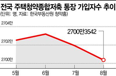 18일 한국부동산원 청약홈에 따르면 8월 31일 기준 전국 주택청약종합저축 전체 가입자 수는 2700만3542명이다. 이는 지난 6월 말 2703만1911명에 비해 3만명 가량 감소한 수치다.