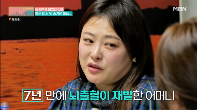 요즘 마음이 어떠냐는 질문에 심진화는 “엄마가 7년 만에 뇌출혈이 재발했다. 병간호를 해야하는데 나한테 너무 놀랐다. 힘들더라. 나도 나이가 든 거다. 나는 아빠가 15년을 아프다가 돌아가셔서 늘 병간호를 해서 익숙하다. 근데 보조침대에서 하루 자고 일어났는데 몸이 너무 안 좋았다”라며 눈물을 보였다.