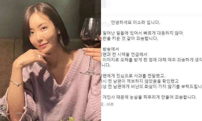 그는 "먼저 방송에서 전 남편과 전 시댁을 언급해서 나쁜 이미지로 오해를 받게 한 점에 대해 매우 죄송하게 생각하고 있다"고 전했다.
