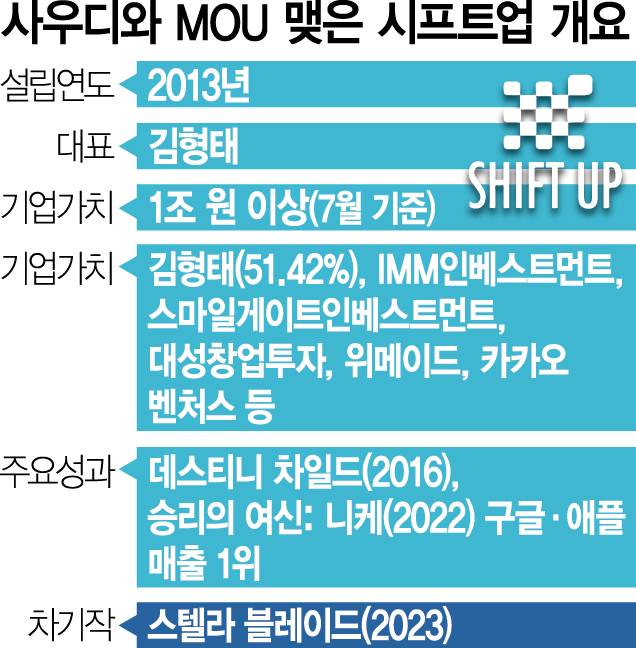 18일 게임 업계에 따르면 김형태 시프트업 대표는 전날 사우디아라비아 투자부와 대한상공회의소에서 업무협약(MOU)을 체결했다. 이번에 사우디 측과 MOU를 체결한 기업 중 게임사는 시프트업이 유일하다. 이 회사는 구글·애플 매출 1위를 기록한 서브컬처 게임 ‘승리의 여신: 니케’ 개발사다. 특히 사우디 측은 시프트업 측에 사우디아라비아로 본사를 옮겨 오라는 ‘파격’ 제안까지 할 정도로 많은 관심을 보인 것으로 알려졌다.