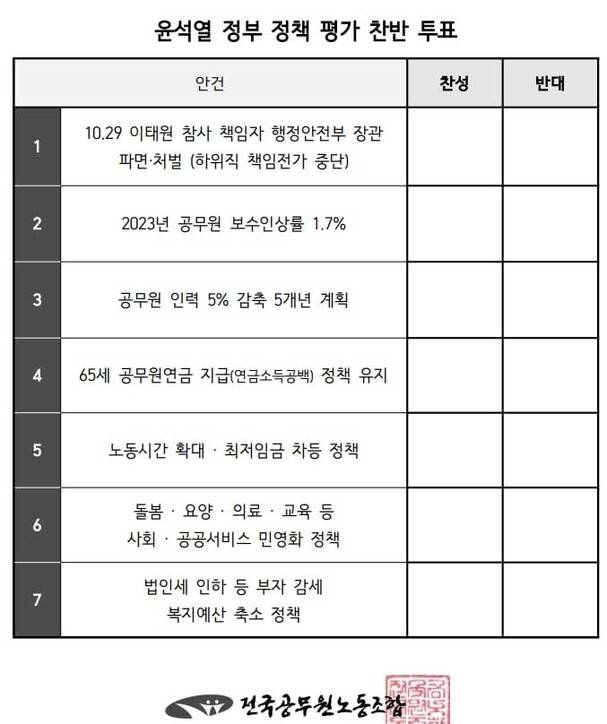 전국공무원노동조합(전공노)이 추진 중인 ‘윤석열 정부 정책 평가 조합원 총투표’에 대해, 정부가 법 위반이라며 지방자치단체 등에 투표참여 금지 공문을 보낸 사실이 확인됐다. 공문에는 투표 참여시 처벌을 받을 수 있다는 내용도 포함돼 있어, 노조가 반발하고 나섰다.