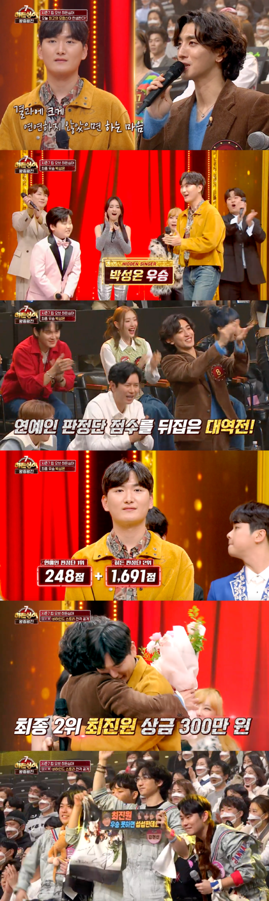 그러나 송가인 모창 능력자로 나선 13살 박성온이 현장 판정단의 지지를 받아 최종 우승을 거머쥐었다. 많은 이들이 우승을 예상할 만큼 최진원의 실력은 압도적이었으나 현장 분위기라는 변수가 생기고 말았다. 아쉽게 2등을 차지했지만 최진원은 잔나비와 함께 한 ‘히든싱어7’를 영원히 기억하겠다고 했다.