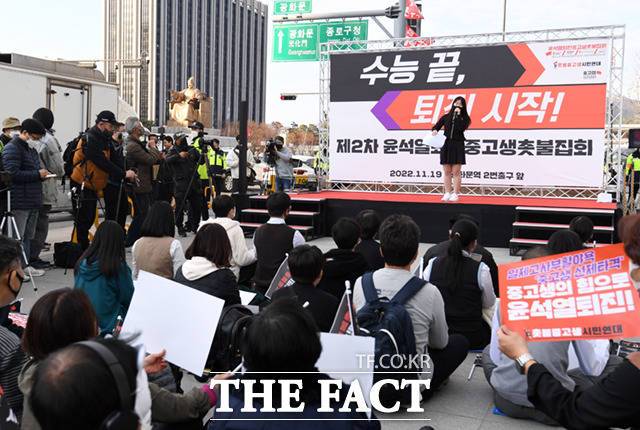 앞서 촛불중고생시민연대는 지난 12일’제1차 윤석열 퇴진 중고생 촛불집회‘를 개최, 약 100명이 모여 '중고생의 힘으로 윤석열 퇴진!', '중고생 촛불집회 탄압, 사과하라!' 등의 내용이 적힌 팻말을 들고 구호를 외쳤다.