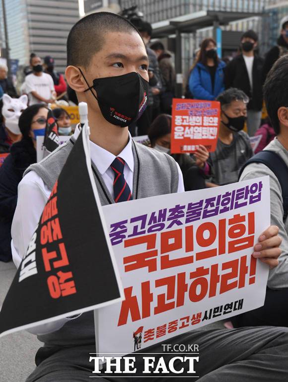 앞서 촛불중고생시민연대는 지난 12일'제1차 윤석열 퇴진 중고생 촛불집회'를 개최, 약 100명이 모여 '중고생의 힘으로 윤석열 퇴진!', '중고생 촛불집회 탄압, 사과하라!' 등의 내용이 적힌 팻말을 들고 구호를 외쳤다.