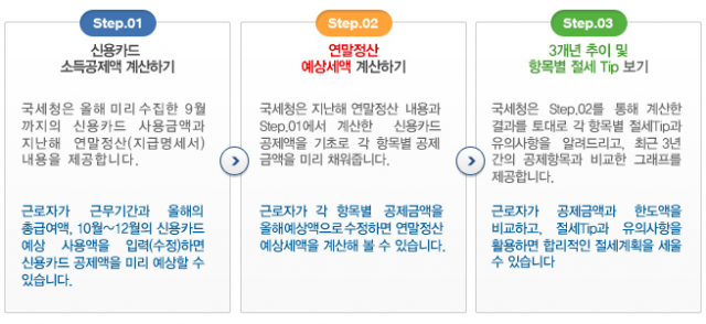 ·1단계: ‘2021년 지급명세서 불러오기’ 클릭(총급여액 및 부양가족 반영, 변동 있으면 직접 수정)→‘신용카드 자료 불러오기’ 클릭(1월부터 9월까지 사용금액 반영)→10월부터 12월까지의 예상금액 직접 입력→저장 후 계산하기 누르면 ‘신용카드 등의 예상절감세액’ 확인 가능