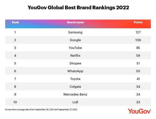 20일 업계에 따르면 최근 유고브가 발표한 2022년 브랜드 순위에서 삼성전자는 총점 127점으로 105점에 그친 구글을 제치고 1위를 차지했다. 유고브는 세계적으로 공신력을 인정받는 글로벌 설문 조사 전문 업체로 지역별 브랜드 순위를 합산해 종합 순위를 산출한다.