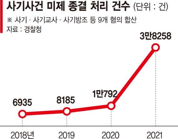 20일 경찰청이 제공한 '사기범죄 미제사건 건수' 자료에 따르면 지난해 경찰이 범인을 잡지 못해 수사 끝에 '미제'로 종결 처리한 사기사건 수는 3만8258건에 이른다. 지난 2018년 6935건에 이어 2019년 8185건, 2020년 1만792건과 대비해 크게 늘었다.