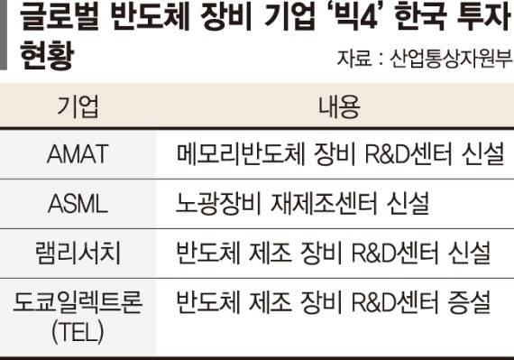 초미세 반도체 공정에 필수적인 극자외선(EUV) 노광장비 독점기업인 네덜란드 ASML을 비롯해 글로벌 장비업계 '빅4'가 국내 직접투자를 단행하면서 한국이 반도체 장비 분야에서 중국의 대체지로 급부상하고 있다.