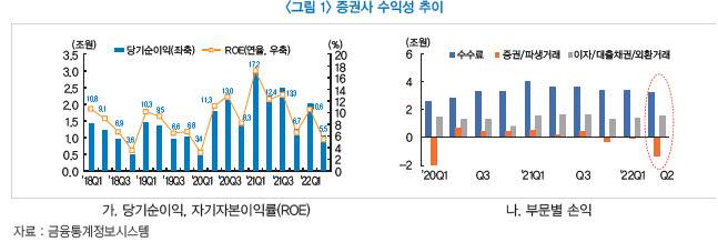 그러나 금리상승 기조 하에서 향후 주식, 부동산 등 자산 가격이 큰 폭 조정될 경우 중소형 증권사를 중심으로 한 수익성 악화가 장기화될 전망이다. 이 경우 개별 증권사의 건전성이 꺾이면서 시장 전반의 유동성 리스크로 전이될 가능성이 제기된다.