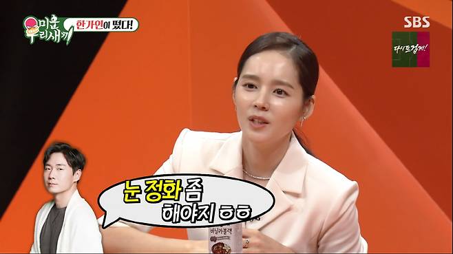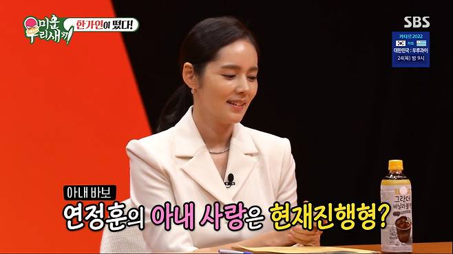 서장훈은 "연정훈이 대한민국 3대 도둑이라는데 연정훈의 아내사랑은 현재진행형이냐"라는 질문에 한가인은 "연정훈이 밖에 나갔다오면 '눈 정화 좀 해야지'라고 한다"라고 말해 모두를 놀라게 만들었다.