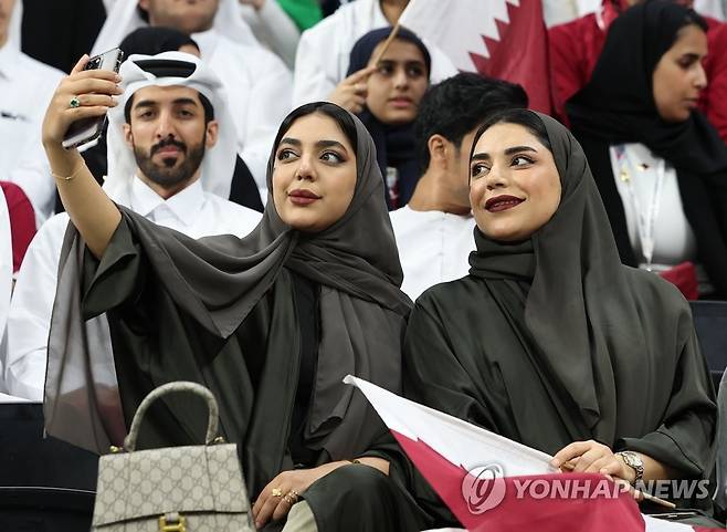 (알코르<카타르>=연합뉴스) 임헌정 기자 = 20일(현지시간) 카타르 알코르 알바이트 스타디움에서 열린 2022 카타르 월드컵 개막식에 앞서 관중이 휴대전화 카메라로 사진을 찍고 있다. 2022.11.20