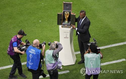 epa10316013 Former French player Marcel Desailly (2-R) presents the FIFA World Cup trophy prior to the FIFA World Cup 2022 group A Opening Match between Qatar and Ecuador at Al Bayt Stadium in Al Khor, Qatar, 20 November 2022. EPA/Ronald Wittek