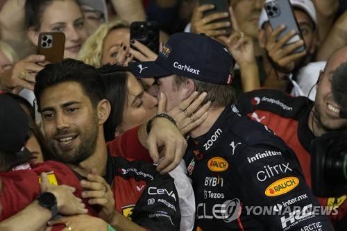 Red Bull driver Max Verstappen of the Netherlands kisses his girlfriend Kelly Piquet after he won the Formula One Abu Dhabi Grand Prix, in Abu Dhabi, United Arab Emirates Sunday, Nov. 20, 2022. (AP Photo/Hussein Malla)