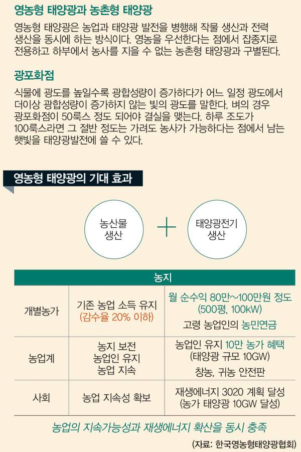 농지에서 식량농사와 햇빛농사를 동시에 지을 수 있는 건 식물에 광포화점이 있기 때문이다. 이성호 에너지전환포럼 이사는 “모든 식물은 광포화점이라고 하는, 성장에 필요한 빛의 양이 정해져 있다. 그 이상 오는 건 식물 성장에 도움이 안 되고 오히려 피로도만 높일 수 있다. 태양광 모듈을 농지 위에 설치해 하루에 필요한 빛만 받을 수 있도록 하고, 이격거리를 둬 빛이 들어오게 하면 햇빛농사도 짓고 식량농사도 지을 수 있다”고 설명했다. 음지식물의 경우 빛을 차단해 필요한 양만 받게 하면 오히려 식물 성장에 도움이 된다. 실제 음지식물인 녹차의 경우 영농형 태양광 아래에서 수확량이 더 증가하는 것으로 나온다.