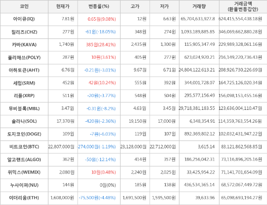 또한, 세럼(10.24%, 452원), 아이큐(9.08%, 7.81원), 폴리매쓰(3.61%, 287원), 위믹스(0.48%, 2,080원)가 상승세를 나타냈다.