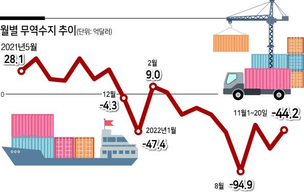 이달 1∼20일 무역수지는 44억1800만달러 적자를 기록했다. 올해 무역수지는 4월부터 10월까지 적자를 기록해 1995년 1월∼1997년 5월 이후 25년 만에 7개월 연속 적자를 나타낸 바 있다.