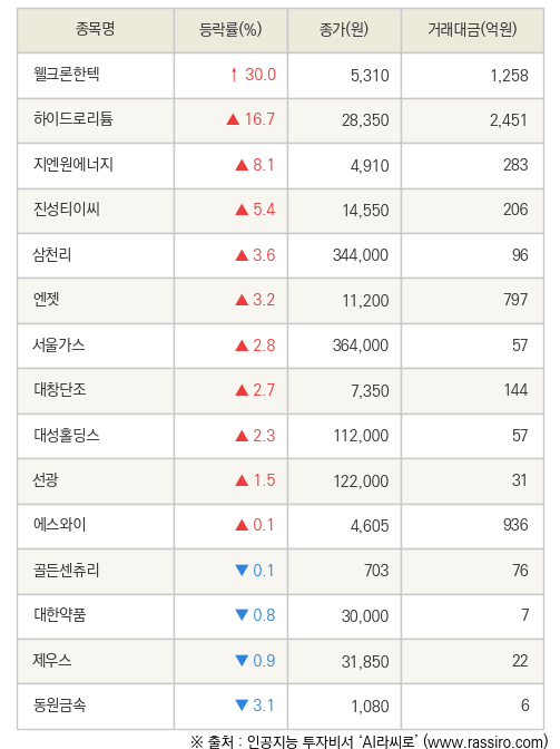 특히 웰크론한텍은 전 거래일 대비 30.0% 오른 5,310원에 거래를 마감하여 높은 관심을 받았다.