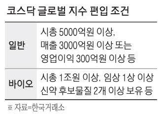 코스닥 글로벌 지수 종목들의 시총 합계는 약 78조원으로 코스닥 전체(336조원)의 23%가량이다. 이들 종목의 평균 시총(1조5000억원)도 지수 편입 기업을 제외한 나머지 기업들의 평균 시총(1700억원)의 9배에 달한다. 편입 기업의 평균 매출액은 7300억원 규모로, 코스닥 전체 평균(900억원)의 8배를 웃돌았다. 거래소에 따르면 코스닥 글로벌 지수의 최근 3년간 수익률은 44%로, 시장 전체인 8.5%를 큰 폭으로 웃돌았다.