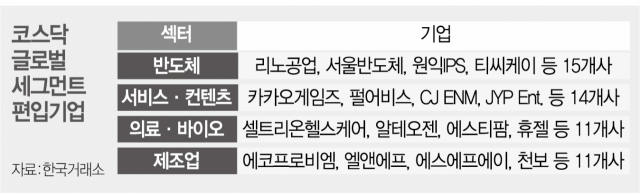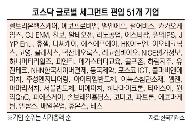 코스닥 글로벌 세그먼트 편입 기업 지정에는 시가총액 및 재무 실적과 지배구조, 기업 건전성, 회계 투명성 등이 고려됐다. 코스닥150지수가 시가총액 위주로 편입 기업을 선정한 것과 달리 투명한 지배구조도 심사 기준인 것이다. 실제로 이날 기준 코스닥 시가총액 4위인 HLB는 글로벌 세그먼트 명단에 포함되지 못했다. 올해 1월 공시불이행으로 불성실공시법인이 된 탓으로 분석된다. 편입을 위해서는 최근 1년간 불성실공시법인 지정 사실이 없는 등 건전성을 갖춰야 하기 때문이다. 제약바이오 기업의 경우 연구 기술의 우수성이나 연구 활동 안정성이 높은 기업은 재무 실적 요건을 적용하지 않는다. 거래소는 선정기업들은 시장평가와 재무적인 측면에서 우수하고 특정 업종에 편중되지 않고 소수 종목으로도 시장 전체를 대표할 수 있다고 설명했다. 또 일부 종목의 문제 발생시 급변동 위험을 최소화할 수 있다는 평가다. 코스닥 글로벌 세그먼트 편입 기업의 시가총액 합계는 78조 원으로 코스닥시장 전체 시총의 23%를 차지한다. 편입된 51개사의 평균 시총은 코스닥 평균의 9배에 달하는 1조 5000억 원 수준이다.