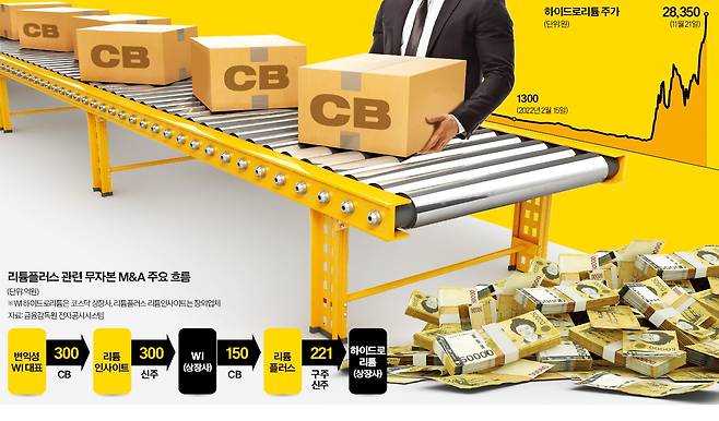 두 상장사는 1800억원 넘는 자금을 조달 중이다. 대부분 CB 발행이다. 리튬 테마를 타고 주가가 폭등하면서 CB 투자자들은 ‘초대박’을 예고하고 있다. 두세 달 사이 하이드로리튬 주가는 2000원대에서 2만8350원(21일 종가)으로 15배 가까이 뛰었다. WI 주가도 800원대에서 3900원으로 점프했다.