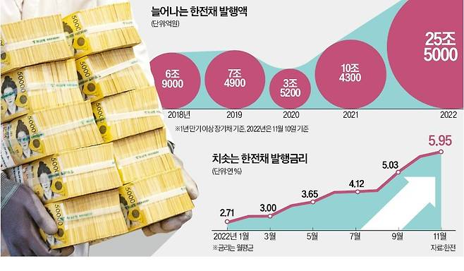 21일 금융투자협회에 따르면 한전은 올 들어 이달 10일까지 25조5000억원어치의 한전채를 찍었다. 지난해 연간 발행액(10조4300억원)의 두 배가 넘는 규모다. 대규모 물량이 쏟아지면서 AAA등급 한전채 금리는 연초 연 2.71%에서 이달 연 5.95%까지 치솟았다.