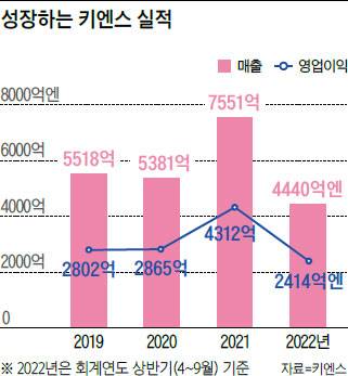 2022회계연도 중간 결산(4~9월)에서 매출은 전년 동기 대비 25% 증가한 4440억엔(약 4조2180억원), 영업이익은 22.3% 늘어난 2414억엔(약 2조2933억원)을 기록했다. 순이익은 27.4% 증가한 1806억엔(약 1조7157억원)에 달했다. 매출과 이익 모두 창사 이후 최고치를 경신했다. 지난해까지 8년 연속 영업이익률 50% 이상을 기록한 키엔스는 올해도 이 기록을 유지하고 있다. 매출은 10년 전과 비교해 3.8배, 영업이익은 4.6배 급증했다. 국내외 투자자들 사이에 신뢰도도 높아 11월 현재 시가 총액에서 소니그룹과 3위 자리를 다툰다.