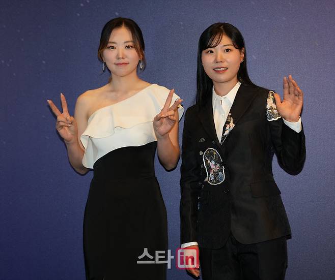 [이데일리 골프in 조원범 기자]21일 서울 삼성동에 위치한 그랜드 인터컨티넨탈 서울 파르나스 그랜드 볼룸에서 ‘2022 KLPGA 대상 시상식’이 열렸다.조아연,이소미가 포토월에서 포즈를 취하고 있다.