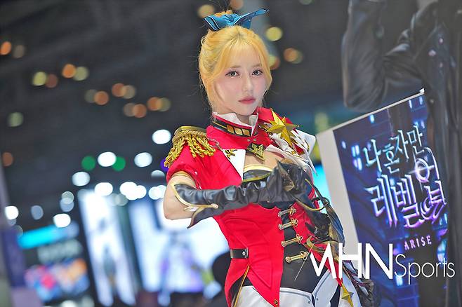 이날 넷마블 부스 모델 임솔아가 포즈를 취하고 있다.