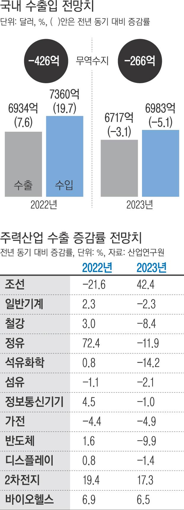 산업연구원은 “원자재 가격이 안정세로 접어들고 원화 약세로 인해 수출 품목 가격경쟁력도 높아질 전망”이라면서도 “세계 경기 둔화로 인한 수요 위축과 반도체 산업 부진 심화 등의 영향으로 수출이 감소세로 돌아설 것으로 예상한다”고 밝혔다.