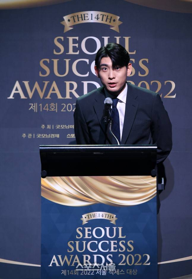 키움 히어로즈 이정후가 21일 서울 그랜드하얏트 호텔에서 진행된 제 14회 2022 서울석세스대상 시상식에서 문화 부문 스포츠대상을 수상한 뒤 소감을 밝히고 있다.