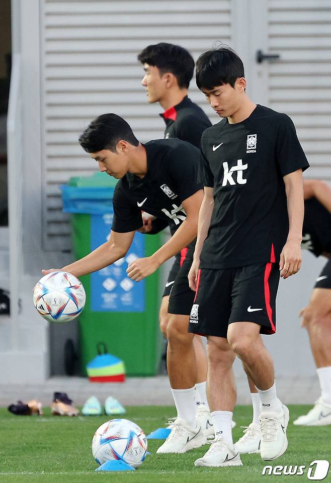 (도하(카타르)=뉴스1) 이동해 기자 = 파울루 벤투 감독이 이끄는 대한민국 축구대표팀 이강인과 김문환이 21일 오후(현지시간) 카타르 도하 알 에글라 트레이닝센터에서 훈련을 하고 있다. 2022.11.21/뉴스1
