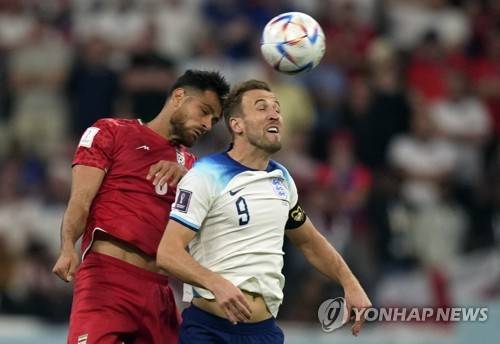 England's Harry Kane, right, jumpss for the ball with Iran's Morteza Pouraliganji during the World Cup group B soccer match between England and Iran at the Khalifa International Stadium in Doha, Qatar, Monday, Nov. 21, 2022. (AP Photo/Frank Augstein)
