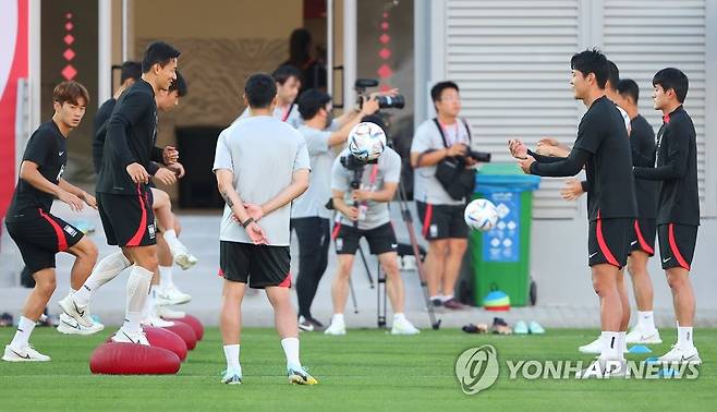 (도하=연합뉴스) 김도훈 기자 = 2022 카타르 월드컵 대표팀 선수들이 우루과이와의 결전을 사흘 앞둔 21일(현지시간) 카타르 도하 알에글라 훈련장에서 훈련하고 있다. 2022.11.21