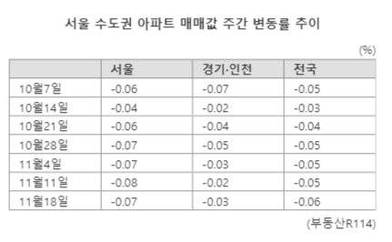 22일 부동산R114에 따르면 지난 18일 기준 서울 아파트값 변동률은 -0.07% 하락했다. 경기·인천은 -0.03% 떨어졌고, 재건축은 -0.17%, 일반 아파트는 -0.05% 각각 내렸다. 지난 14일부터 서울과 과천, 성남(분당·수정), 하남, 광명을 제외한 수도권 전역이 규제지역에서 해제됐다. 지방에서 유일하게 규제지역으로 남아 있던 세종도 함께 풀렸다.