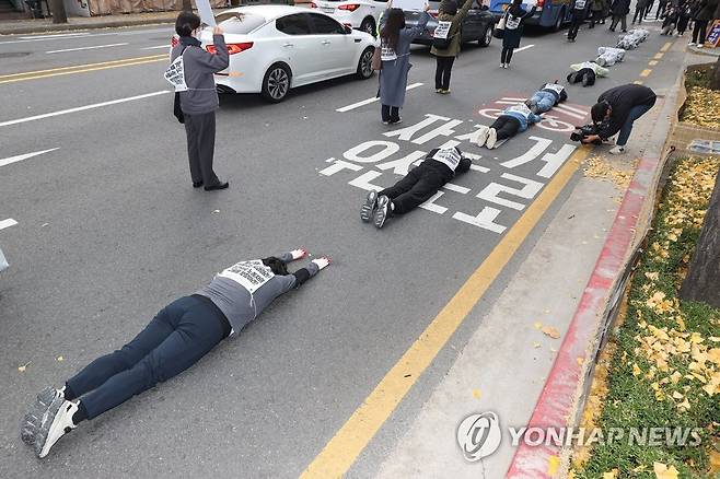 (서울=연합뉴스) 신현우 기자 = 대한불교조계종 조계사와 서울시 마을공동체 종합지원센터 관계자들이 22일 오전 서울 종로구 조계사에서 서울시청까지 서울시 마을공동체 활성화 지원 조례 폐지안 철회를 촉구하며 오체투지 삼보일배를 하고 있다. 2022.11.22