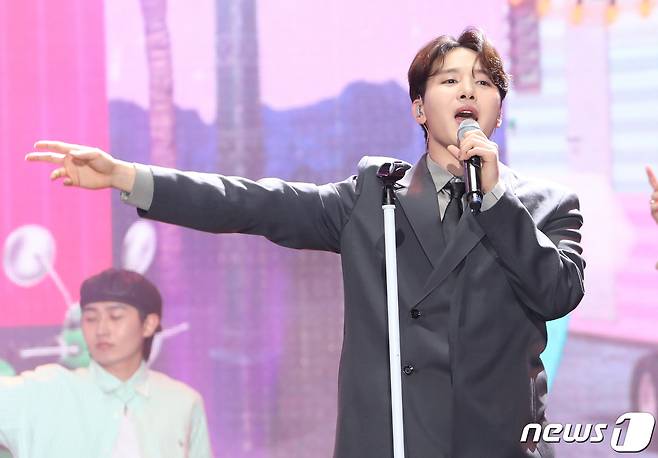 (서울=뉴스1) 권현진 기자 = 고막소년단이 김민석이 22일 오후 서울 강서구 KBS아레나에서 가진 데뷔 미디어 쇼케이스에서 신곡 ‘단거’를 선보이고 있다.