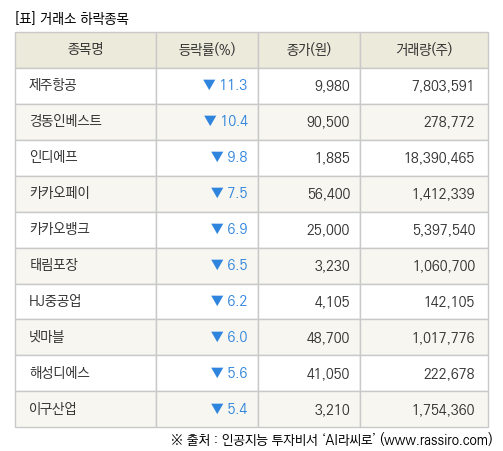[fnRASSI]장마감, 거래소 하락 종목(제주항공 -11.3% ↓)